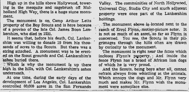 Joe Seewerker and Charles Owens documented the obelisk in one of their Nuestro Pueblo pieces dated June 2, 1939, noting that it stood adjacent to Errol Flynn’s ranch with Lankershim’s ashes underneath.