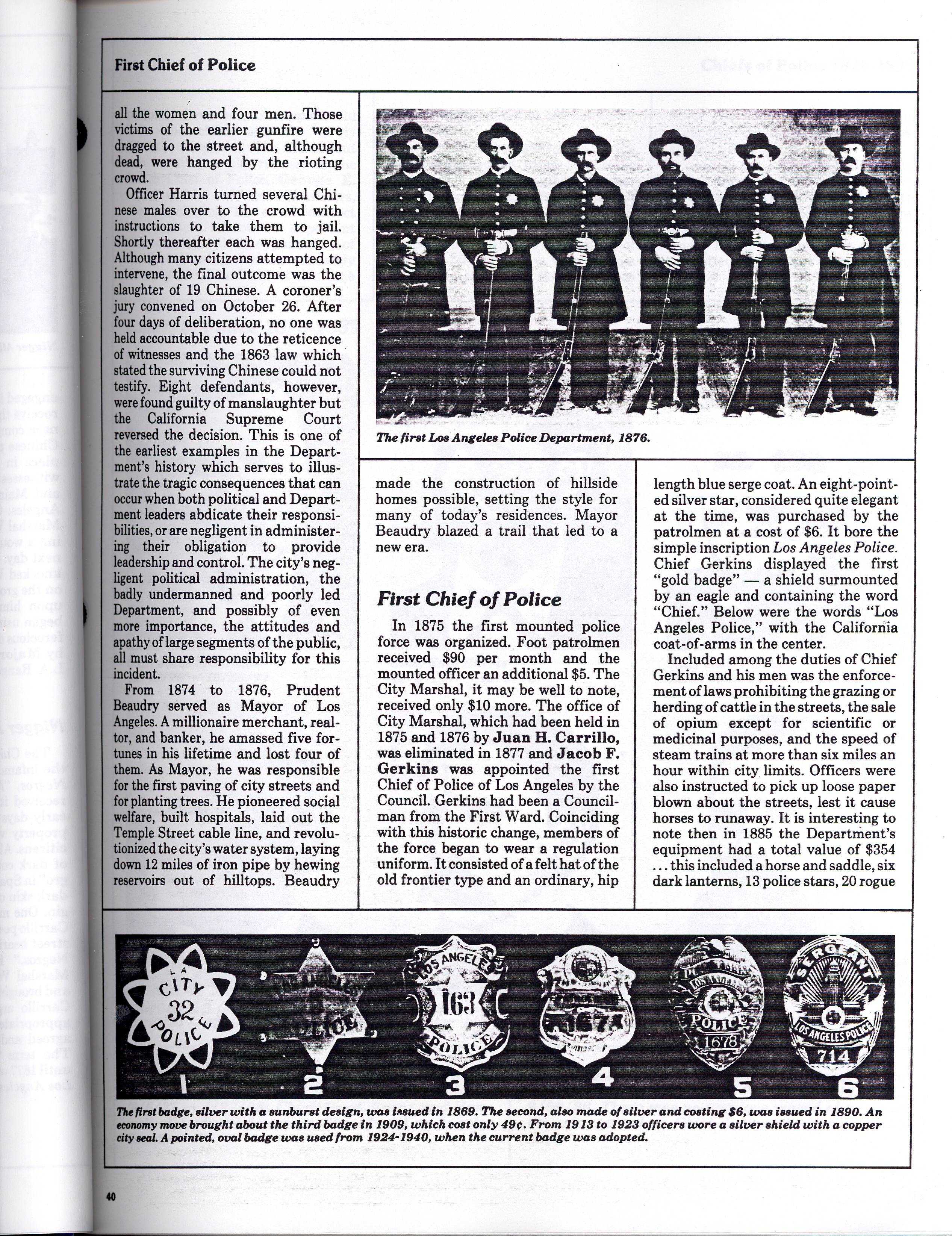 The photo published on Page 40 of LAPD Capt. Art Sjoquist’s 1984 “History of the Los Angeles Police Department” labeled as “The first Los Angeles Police Department, 1876” has been the subject of more recent research by Glynn Martin, executive director of the Los Angeles Police Museum. In a 2006 blog post, Martin states that the photo has been displayed at the museum with a brass plaque bearing the incorrect date of 1869. The photo is undated, but research indicates that it was taken between 1887 and 1901, based on the career of Officer Henry W. Marden (d. 1909), one the officers in the photograph.