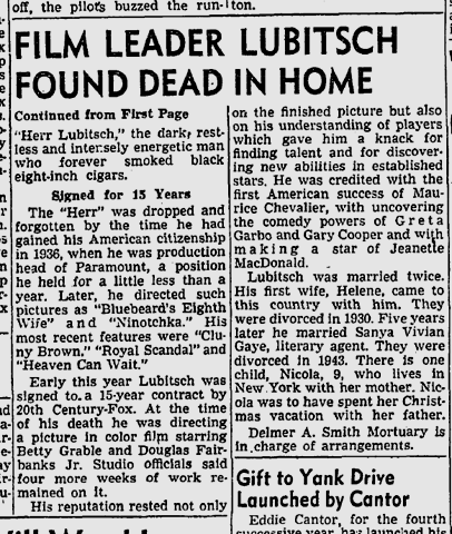 Bonus factoid: Ernst Lubitsch dies at his home in Bel-Air. He is 55.