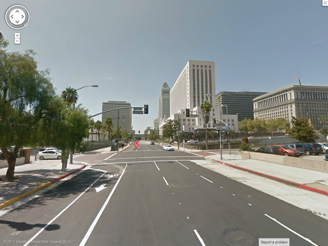 Behold, the hand of progress: Main and Arcadia, site of the Baker Block, via Google Street View.