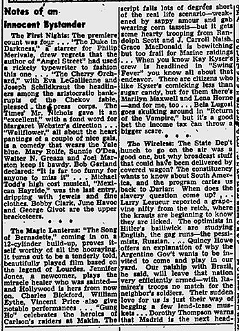 Feb. 1, 1944: “The Duke in the Darkness,” a starrer for Philip Merivale, drew regrets that the author of “Angel Street” had used a rickety typewriter to fashion this one … “The Song of Bernadette,” coming in on a 12-cylinder build-up, proves itself worthy of all the hooraying…. Jennifer Jones, a newcomer, plays the miracle healer who was sainted — and Hollywood is hers from now on.