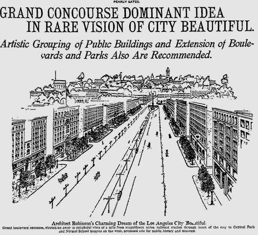 “First of all, and most important in his mind because Los Angeles is a leading tourist center and should strive to make a good impression at the very start, the architect suggests an immense union railroad station with an approach a mile long—a wide thoroughfare lined with beautiful buildings, with spacious parkways, rows of flowering trees and ornamental lamp posts, and with driveways for all classes of traffic,” The Times says.