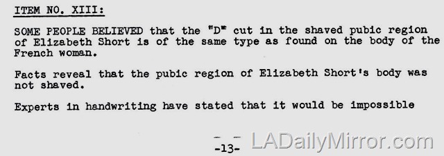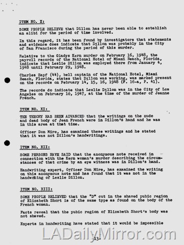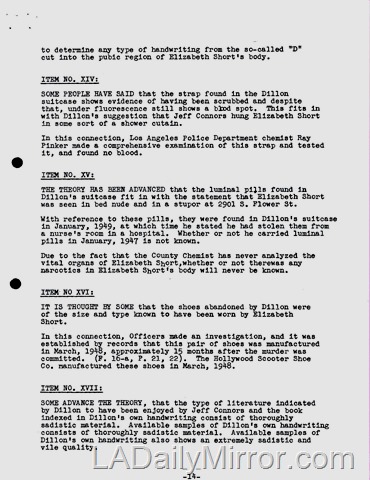 Next we take Pages 13-14 of the Nov. 23, 1949, document “Evidence and Declarations Tending to Connect or Disconnect Leslie Dillon to the Murders of Elizabeth Short, Jeanne French and Gladys Kern.”