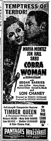 In the theaters: “Cobra Woman” and “Timber Queen.”