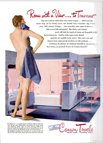 What the postwar bathroom will look like in another racy ad (by 1940s standards) from Cannon Towels.