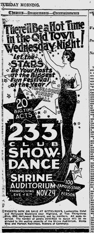 Unfortunately, financial problems seemed to weight down the group. The pageant left debts of over $6,500, causing the 233 Club to organize a massive show and dance at the Shrine Auditorium on November 24, 1926 to cover costs, as well as to help build the construction fund for the new building. Stars, bands, and vaudeville performers would entertain in the show directed by Fanchon and Marco, along with the 50 piece 233 Club Band, 233 Club Symphony Orchestra, and 233 Club Sax-o-Seven. Actor Herbert Rawlinson served as Master of Ceremonies for the show, for which the paper announced Mary Pickford, Corinne Griffith, Mary Astor, and others had already purchased tickets. Many stars appeared at the show to draw the public, and then everyone danced until the wee hours of the morning.