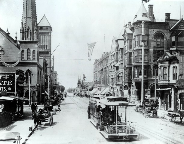 This photo looking south on Broadway is the approximate location of where I found the ties, although this car appears to be one of the cable cars that were briefly installed in downtown and pulled by an underground cable rather than using overhead electrical power.