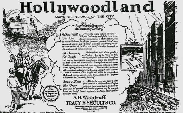 On September 7, 1923, developer S. H. Woodruff hired Burrud as publicity chief for Hollywoodland after noticing his work as press man for Lake Arrowhead, promoting that real estate development. Here, he met Los Angeles advertising man John Roche, who would go on to design the Hollywoodland sign for development partner Harry Chandler. This sign would dwarf all other real estate name signs around Los Angeles, including Whitley Heights, Outpost Estates, Bryn Mawr, Bel-Air, and the like, all intended as temporary advertising signposts.