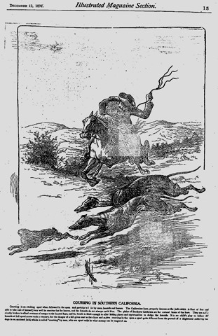 “Coursing,” a form of wagering on greyhounds that are released to catch a live rabbit (a practice that is now illegal), is conducted at what is now Exposition Park, Fourth of July 1889.
