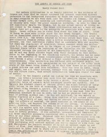 The first lecture, titled “The Adepts in Greece and Rome,” begins: