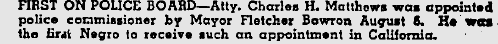 Jan. 2, 1947: The Los Angeles Sentinel publishes the photo of Charles H. Matthews on Page 1 as part of its roundup of major stories from 1946. Matthews, a former deputy district attorney and an NAACP executive at the time, was appointed to the Los Angeles Police Commission by Mayor Fletcher Bowron. The mayor also appointed Agnes Albro, identified universally as Mrs. Curtis Albro, the first woman named to the commission; and Bruno Newman, a mining engineer and attorney for the Mexican Consulate who had lived in Mexico for many years.
