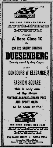 Gary Cooper’s 1935 Duesenberg SSJ is heading for auction by Gooding and Company, Aug. 24-25 at Pebble Beach. The car was on display at the Briggs Cunningham Automotive Museum in Costa Mesa and later acquired by the Miles Collier Collections.