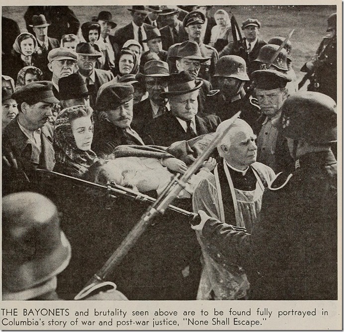 After experiencing several name changes to “Lebestraum,” “Day Will Come,” and “Night,” the studio finally settled on the title “None Shall Escape,” a fitting title for a story about deplorable villains receiving their just deserts, unable to escape scot free. This theme followed the dictum announced by Allied leaders Winston Churchill, Franklin Roosevelt, and Joseph Stalin that all war criminals would be tried and punished for their actions upon a declaration of peace.