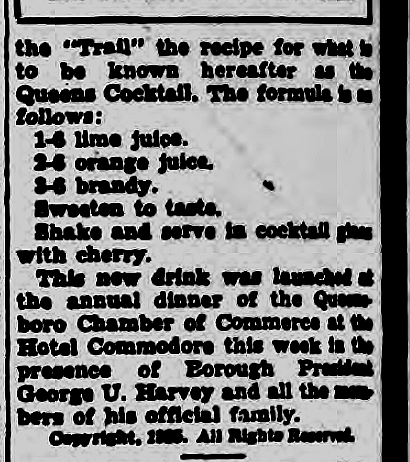 According to the Jamaica Long Island Daily Press, Jan. 24, 1935, the Queens Cocktail debuted at the Hotel Commodore in a toast to President Roosevelt. Via Fultonhistory.com.