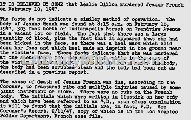 Dist. Atty’s Lt. Frank Jemison’s report on Leslie Dillon, Nov. 23, 1949. According to this report “P.D.” rather than the widely reported “B.D.” was written on Jeanne French’s body.