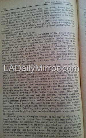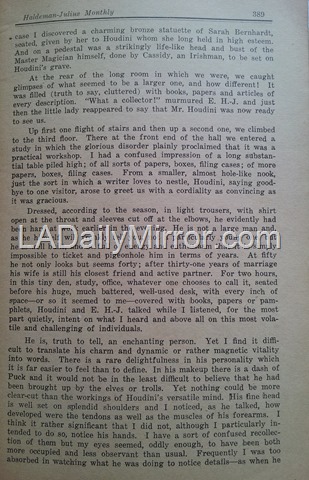 Emanuel Haldeman-Julius loved to debunk charismatic religious figures of the day and Louis Adamic wrote a series of articles for the magazine about Los Angeles evangelist Aimee Semple McPherson’s mysterious disappearance and miraculous return in 1926. In this vein, the bulk of the Houdini interview is devoted to the charlatans of the day posing as mediums who could communicate with the dead and frequently duped grieving and gullible survivors. There is also a detailed of description Houdini’s New York brownstone, which was crammed with books and memorabilia, and a cameo appearance by Mrs. Houdini.