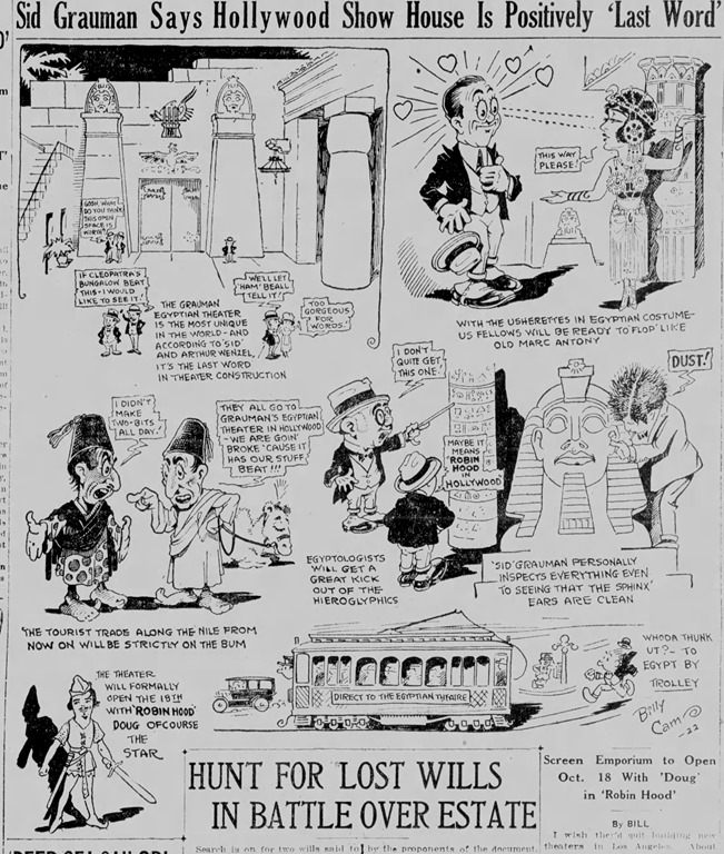 On Oct. 18, Hollywood’s Egyptian Theatre turned 100 years old. Built and operated by legendary showman Sid Grauman, the spectacular theater introduced major Hollywood premieres and radio broadcasts as it became a mecca of entertainment for Southern California. The successful theater demonstrated the business and creative acumen of the shrewd exhibitor as he formed the template of the Hollywood premiere and its publicity possibilities by showcasing and expanding his creative genius.