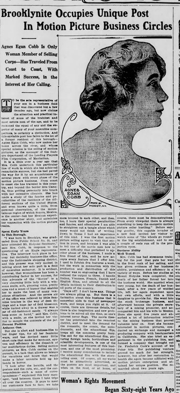 Egan found her passion in distribution, beginning a sales career buying and selling both foreign and domestic films and masterful at selling herself through publicity. In 1912, Egan Cobb gained recognition when she became sales agent and general office manager for Itala Films in America, with Moving Picture World calling her “one of the best known young women in the film business…Miss Egan possesses several years’ experience, a good personality and a vast acquaintance in the trade, which makes her a valuable asset.” Many stories praised her charming and outgoing personality, with the Brooklyn Daily Eagle in 1914 proclaiming she “is a very charming little lady with a winsome smile, soft, pleasing voice, pretty eyes and a sense of humor that enables her to make the best of many vexatious situations.”