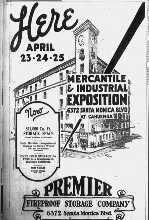 Quickly filling up space, the company pulled permits in December 1924 to add another six-story building to the east which would adjoin the current one, creating over 810,000 cubic feet of storage space between the two. The company added its own truck line to transfer goods to San Francisco, San Diego, and even across the United States. General Manager Rodney Spriggs decided to help promote the building in 1925 by hosting the Hollywood Mercantile and Industrial Exposition in the facility. Not long after the company began renting storage to film companies.