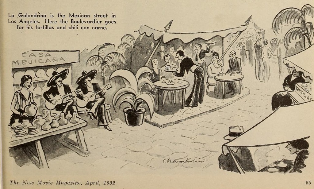 Both La Golodrina and Olvera Street quickly became popular with local residents who adored the charming, romantic look of the city’s early history. Movie stars and celebrities such as Greta Garbo, Joe E. Brown, Warner Baxter, Ramon Novarro, Ronald Colman, William Powell, Gary Cooper, and Antonio Moreno descended on the Street, happy partakers of Mexican food such as guacamole, chicken mole, and chicken taquitos at La Golondrina and audience members at the puppet theatre located on the street. Consuelo charmed audiences, bubbly and infectious in her Spanish, though she spoke English. Musicians strummed guitar and marimba while waitresses dressed in native garb also sung to audiences.