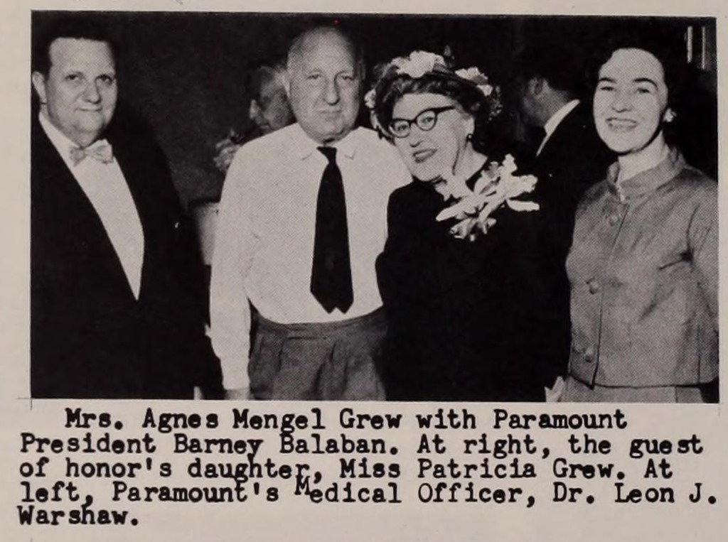 In 1946, Grew was elected the first female President of the Paramount Pep Club, which she had joined in 1921. After her election, she led the effort to change its name to the Paramount Pictures Club, Inc., a more distinguished and business sounding name. She found time as well to head Paramount’s Catholic group and the Choral Society, even organizing fundraisers at which the group would sing.