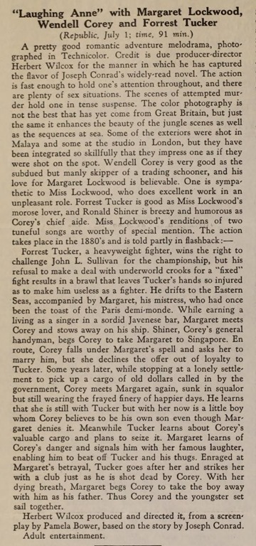 This week’s mystery movie was the 1954 Republic picture Laughing Anne, with Wendell Corey, Margaret Lockwood, Forrest Tucker and Ronald Shiner.