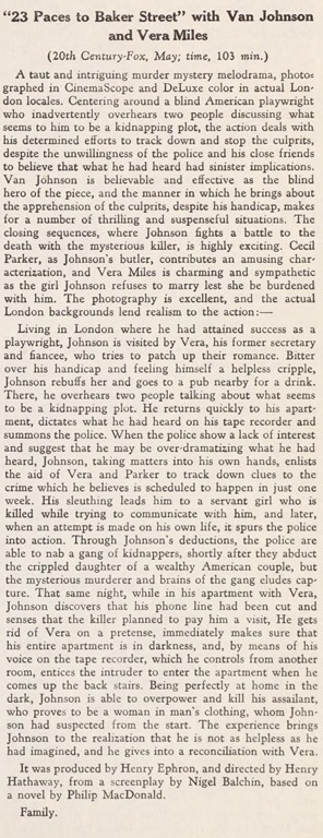 This week’s mystery movie was the 1956 Twentieth Century-Fox film 23 Paces to Baker Street, with Van Johnson, Vera Miles, Cecil Parker, Patricia Laffan, Maurice Denham, Estelle Winwood, Liam Redmond, Isobel Elsom, Martin Benson, Natalie Norwick and Terence de Marney.