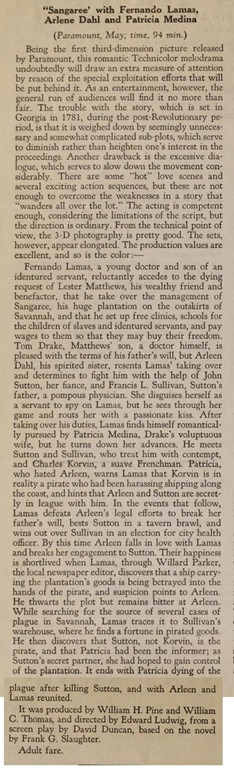 This week’s mystery movie was the 1953 Paramount film Sangaree, with Fernando Lamas, Arlene Dahl, Patricia Medina, Francis L. Sullivan, Charles Korvin, Tom Drake, John Sutton, Willard Parker, Charles Evans, Lester Mathews, Roy Gordon, Lewis L. Russell, Russell Gaige and William Walker.