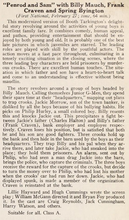 PENROD AND SAM. Without seeing it, I can tell you that the 1923 silent version which exists and which has a completely different story has a more well known cast and is a much better film. Mildred Gover Monday, Philip Hurlic Tuesday, Harry Watson Wednesday, and Spring Byington and Frank Craven today.