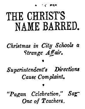 The superintendent’s order was not written, but made in a statement during the Dec. 5 meeting of school principals. An anonymous school official told the paper: “He said we were to make [Christmas] an occasion of good cheer; that the city schools are not Sunday schools. He did not say it in so many words, but the interpretation of myself and practically all the principals was that we were to see to it that no reference was made to Christ.”