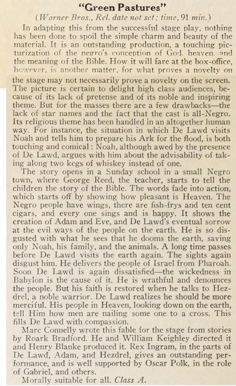 Because The Green Pastures originated on Broadway (with Edna Mae Harris and William Cumby in the original 1931 cast and the 1935 revival) I’m going to guess that The New York Times (probably Mordaunt Hall?) gave it a good review. The script is here, via Archive.org.