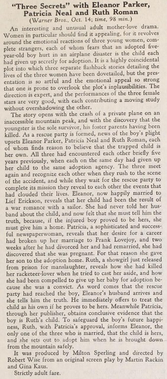 The plight of a 5-year-old boy stranded on a California mountain top as sole survivor of a plane wreck in which his foster parents have been killed is the circumstance which brings together the separate dramas of three women’s lives in Warner Bros.’ Three Secrets, the new picture at the Strand. And although it is incidental to the rather mawkish stories of the dames, this desperate situation of the youngster makes for the affecting drama in the film.