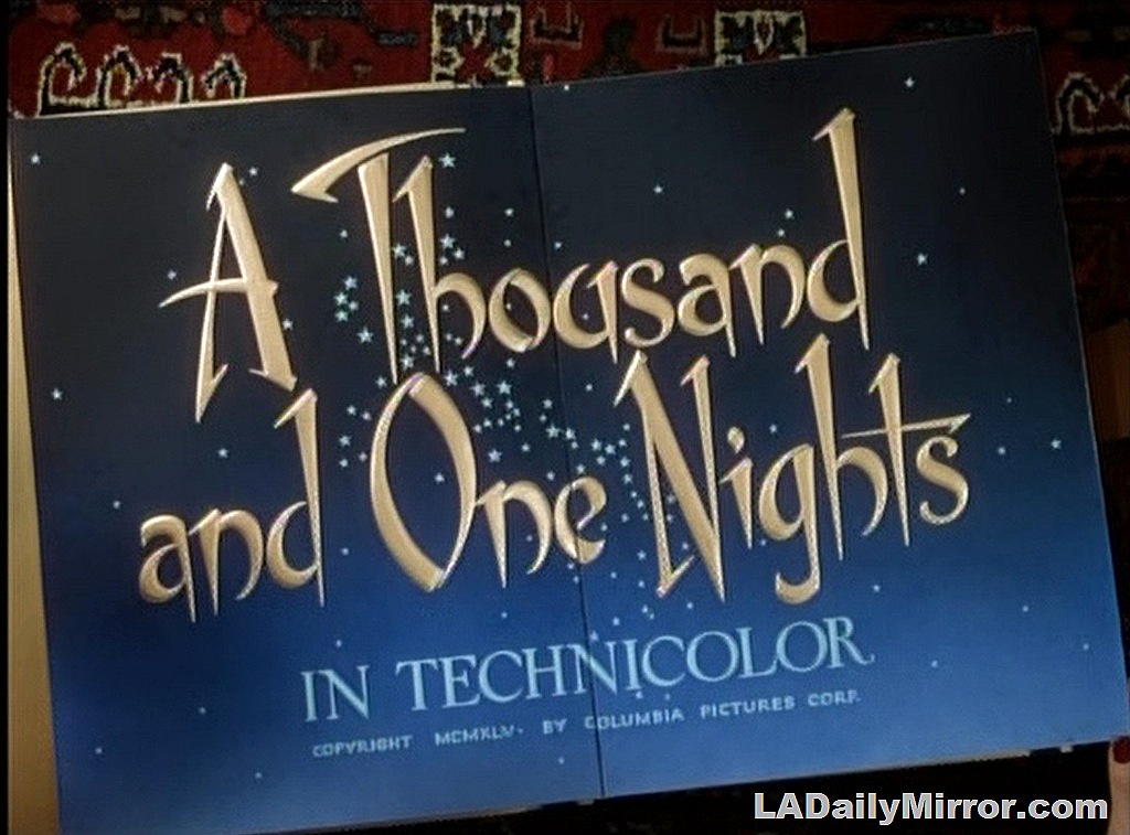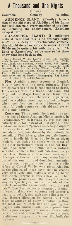 A strictly bobby-socks version of the story of Aladdin and his lamp has been whipped up by Columbia in its gaudy A Thousand and One Nights, which came yesterday to Loew’s Criterion like a bolt out of a Sherman tank. There are no magic carpets in this one, no horses with sky-beating wings; there are just a lot of elegant females and a couple of gents who make colloquial gags. In other words, it’s a typical Hollywood harem-scare ’em film with the comedy cut to the fashion of the modern swoon-spooning school…. It will probably prove quite amusing to folks who go for slick chicks and “wolf” wit.