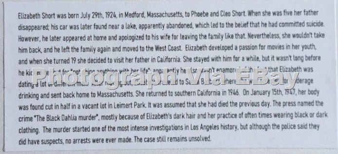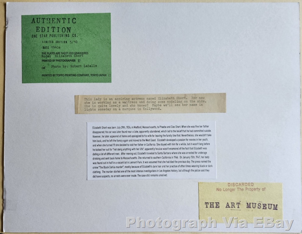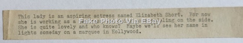 The listing has been removed after several people complained, but I’m posting this image in case it surfaces again: A vendor on EBay listed a rather elaborately faked pinup photo, purportedly of Elizabeth Short. And, no, it’s not her.