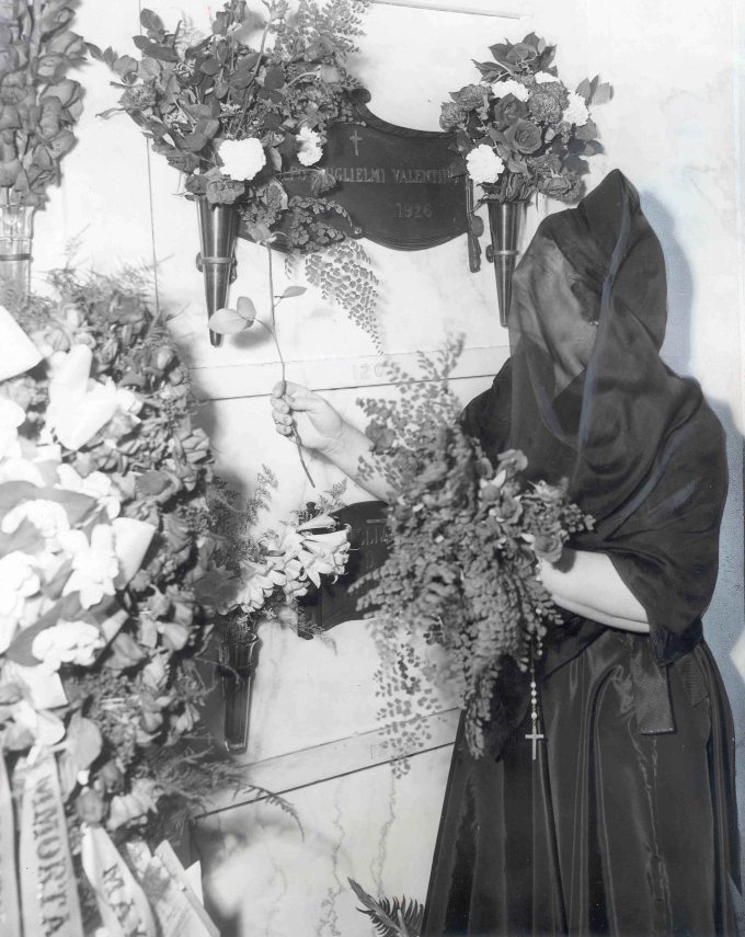 Here’s the earliest photograph I could find of a Lady in Black mourning Rudolph Valentino, Aug. 23, 1937, 11 years after the movie star’s death. In the first few years, memorial services were held on the anniversary, although the services eventually ceased and the large crowds dwindled to about 50 mourners.