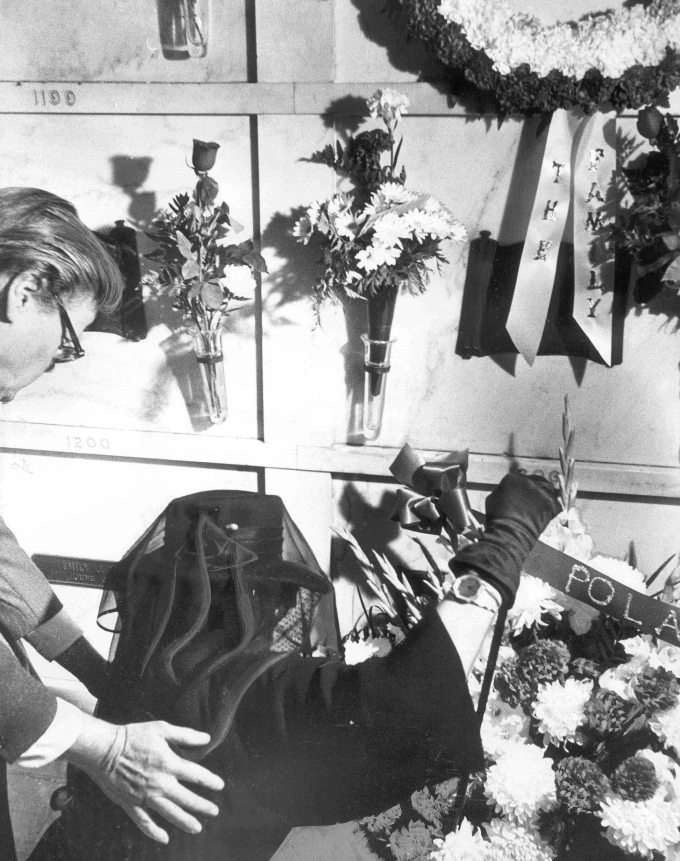 Photograph by William S. Murphy / Los Angeles TimesOn Aug. 23, 1976, the 50th anniversary of Valentino’s death, a Lady in Black and her companion arrived in a black limousine. “She knelt in silent homage and appeared to weep,” photographer William S. Murphy wrote. |