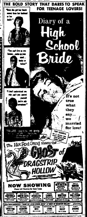 [Note: “Ghost of Dragstrip Hollow,” one of Sanita Pelkey’s few screen appearances.]