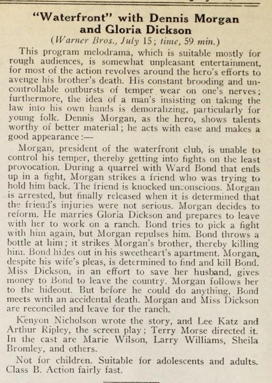 WATERFRONT. Aldrich Bowker and Dennis Morgan BOTH Monday, Charles Trowbridge Tuesday, Ward Bond and Gloria Dickson BOTH Wednesday, today Sheila Bromley, John Hamilton, Frank Faylen.