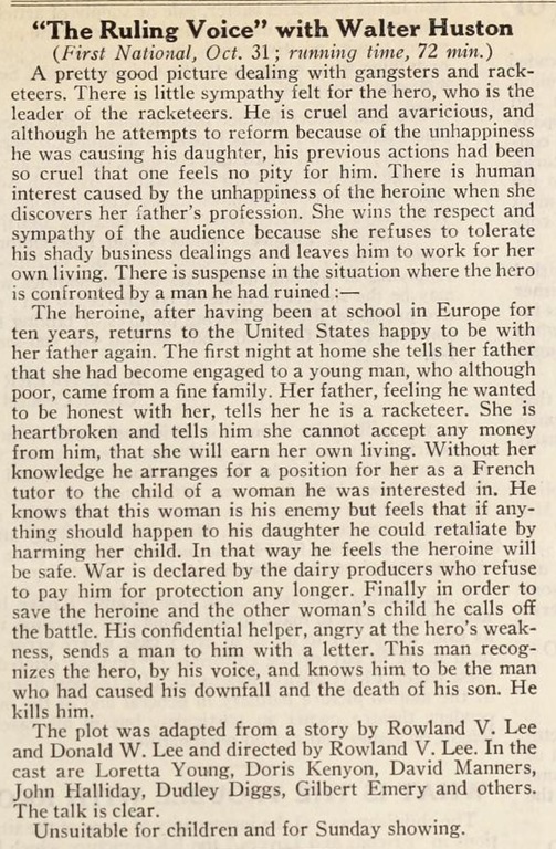 This week’s “unsuitable” mystery movie was the 1931 First National Pictures film The Ruling Voice, with Walter Huston, Loretta Young, Dudley Digges, David Manners, Doris Kenyon, John Halliday, Willard Robertson, Gilbert Emery and Douglas Scott.