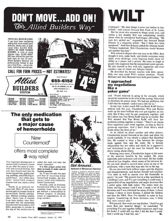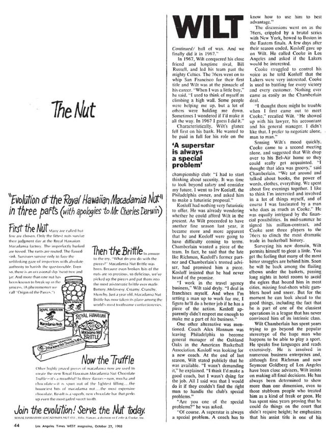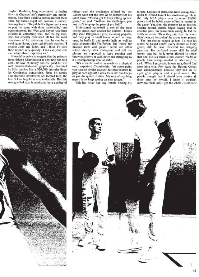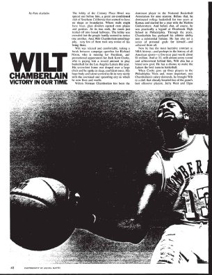 Axthelm quoted New York Post columnist Milton Gross, who had a different rationale for Chamberlain’s endorsement: “He will be so affluent under his new contract [with the Lakers] he can afford to be a Republican.” Axthelm had another, simpler theory–Wilt considered Nixon a friend. “You notice how little [Chamberlain] smiles,” said Boston Celtics star Bill Russell, a close friend despite their political differences. “That’s not because he’s angry all the time. It’s because he’s lonely. An outsider.” |