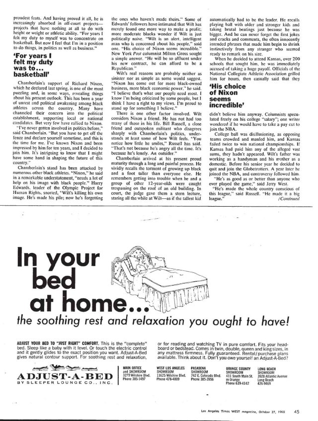 “I’ve never gotten involved in politics before. But you have to get off the fence and declare yourself sometime and this is the time for me,” Chamberlain told sportswriter Pete Axthelm in a long profile published in The Times. “I’ve known Nixon and been impressed by him for 10 years and I decided to join him. It’s intriguing to know that I might have some hand in shaping the future of this country.”
