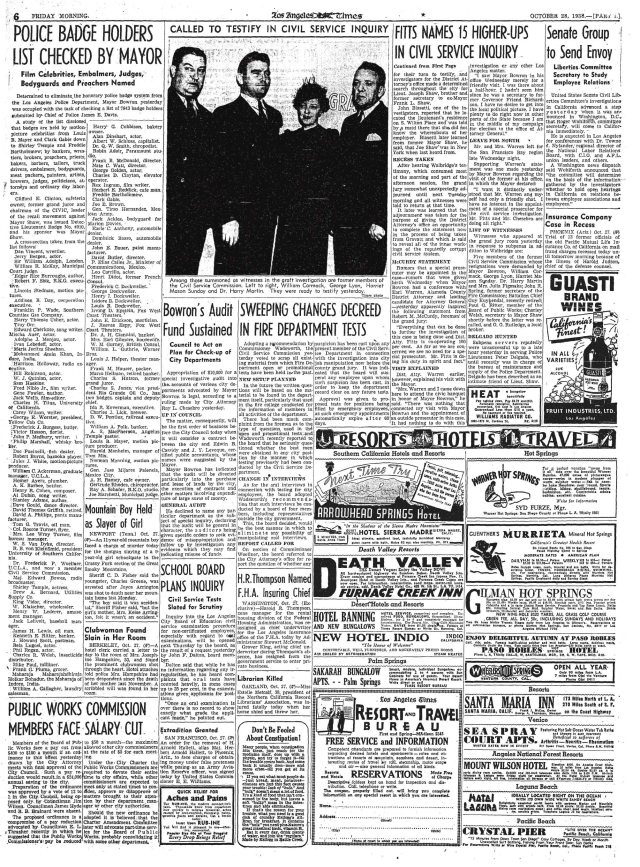 Above, Police Chief James Davis turns over a list of more than 7,800 people who have received honorary badges from the Los Angeles Police Department. Recipients include Shirley Temple, Clark Gable, Louis B. Mayer, Joe E. Brown, King Vidor, Bela Lugosi and Leo Carrillo.