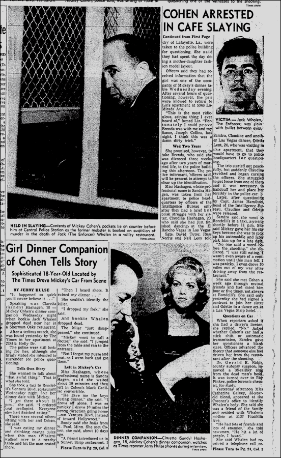 Mickey Cohen is booked on suspicion of murder in the shooting of Jack “the Enforcer” Whalen, along with George Piscitelle and Sandy Hashagen, 18, who was found by The Times at 2284 1/2 Holly Drive.