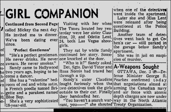 | Dec. 4, 1959: Mickey Cohen is “a perfect gentleman,” Sandy Hashagen says. “He never drinks. He never swears. He never smokes.” |