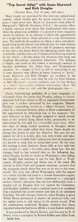 This week’s mystery movie was the 1957 Warner Bros. film Top Secret Affair, with  Susan Hayward, Kirk Douglas, Paul Stewart, Jim Backus, John Cromwell, Roland Winters, A.E. Gould-Porter, Michael Fox, Frank Gerstle and Charles Lane.