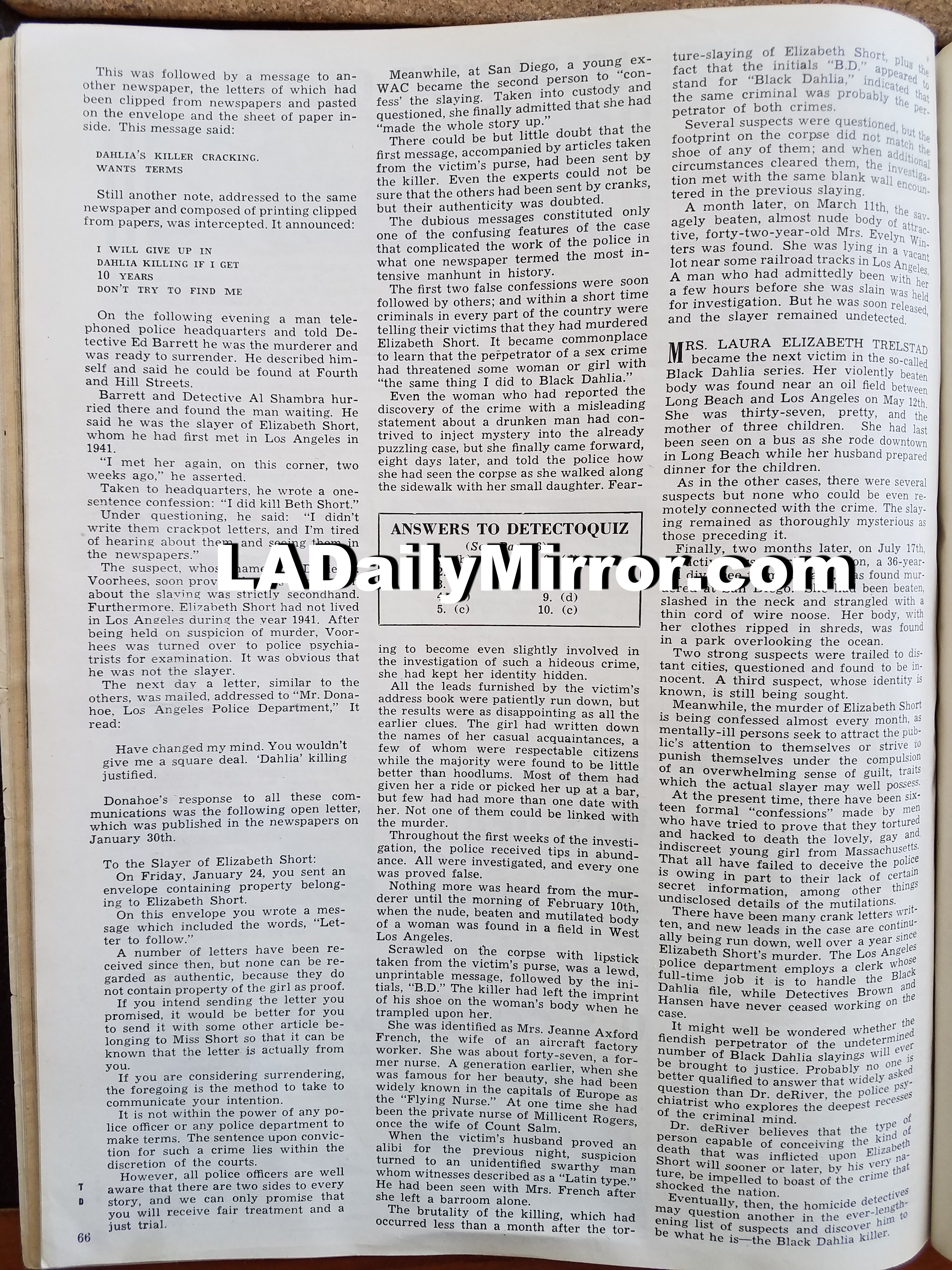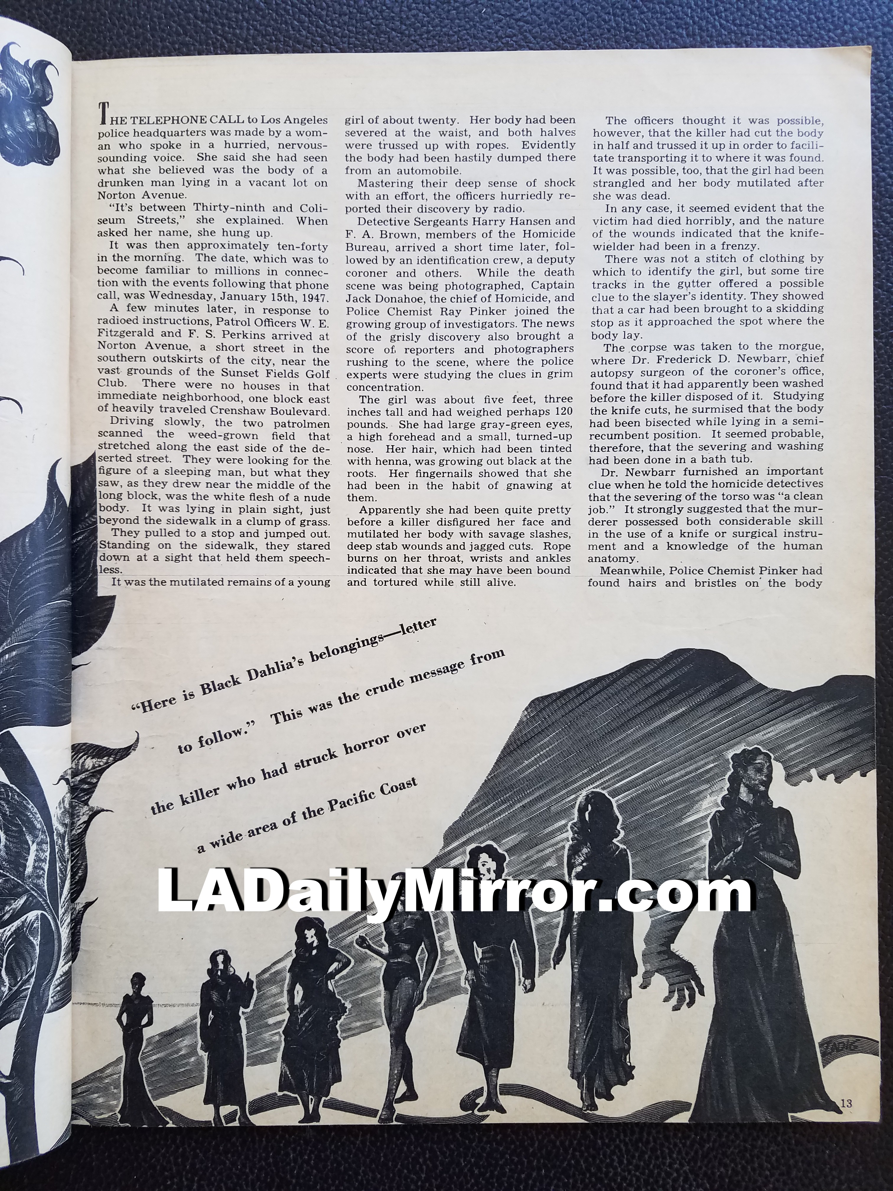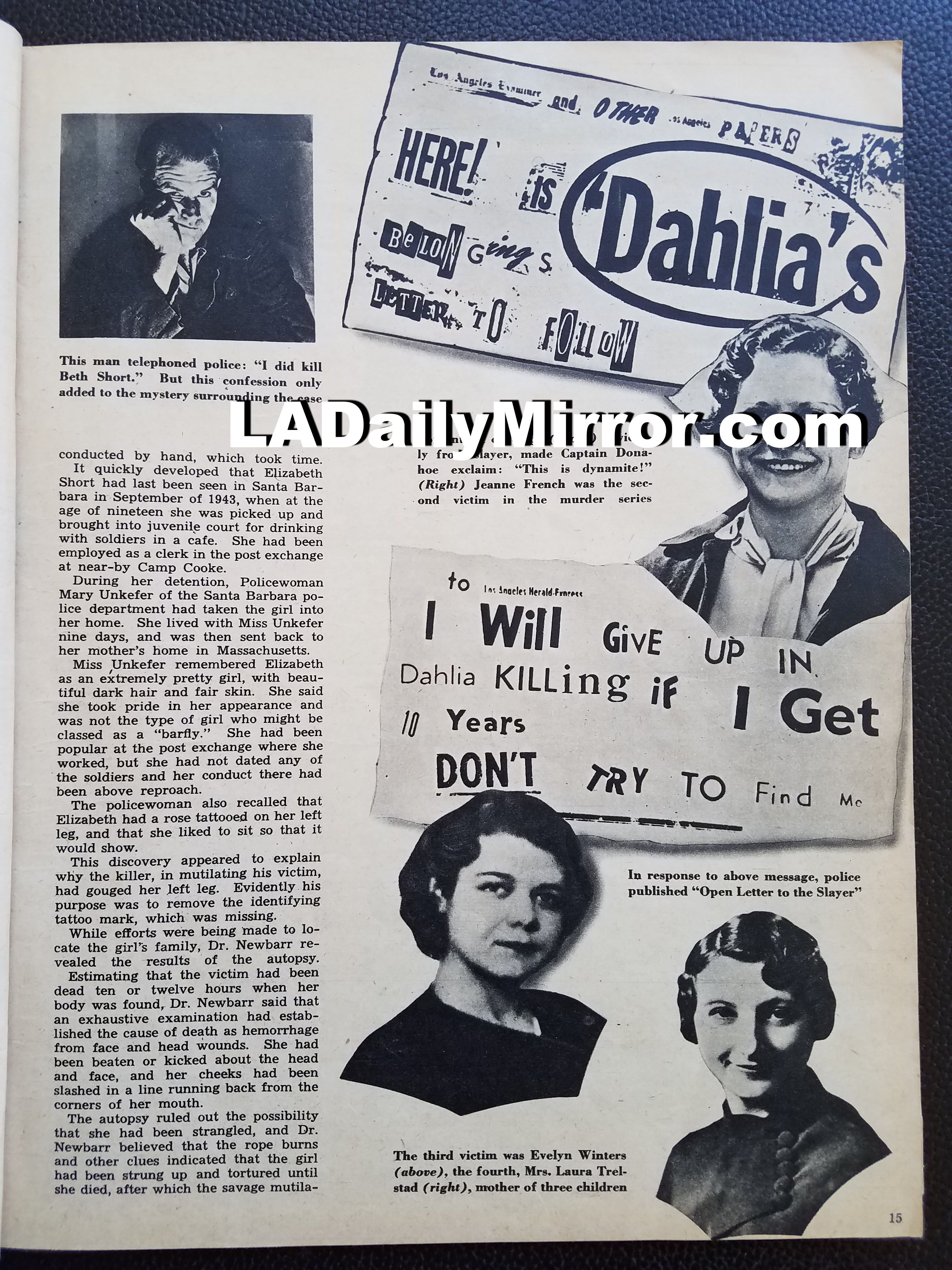 I’m going to begin with “The Black Dahlia Murders,” by George Clark, from the October 1948 issue of True Detective. This isn’t the first pulp magazine article about the murder of Elizabeth Short, but it is by far the most influential because it resulted in the Leslie Dillon debacle.