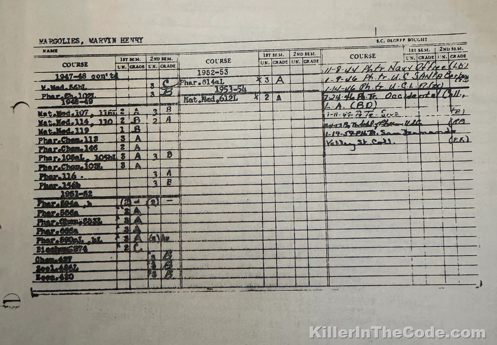 The class listings for “M. Med.” on Margolies’ transcripts are pharmacy classes rather than medical school classes. “M. Med.” is an abbreviation for the Latin term “Materia Medica” and the classes covered Toxicology, Pharmacology and “Posology,” according to USC’s college catalog for 1947-48.