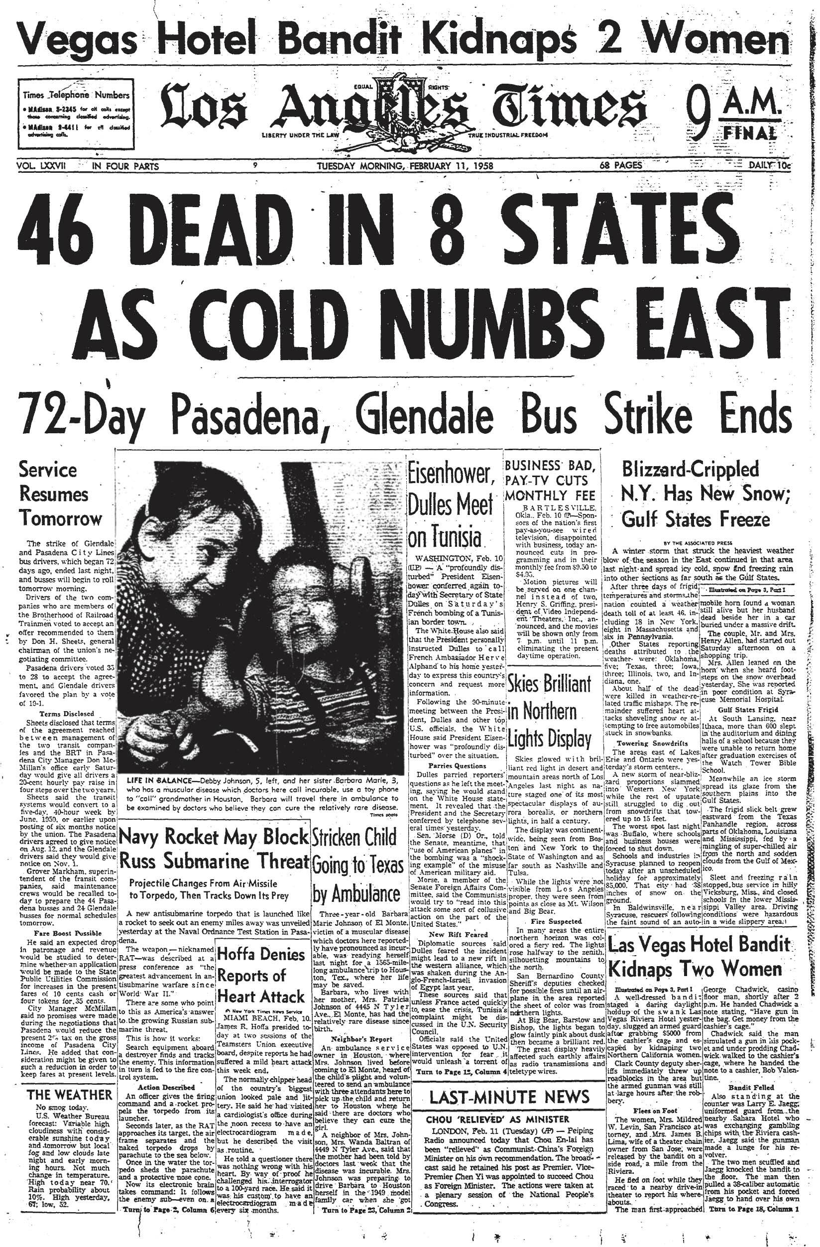 Weather makes the front page … Another youngster is stricken with a rare disease (The Times apparently never followed up on this story) … Fighting in the Mideast … And a new weapon in the Cold War against the Soviets …