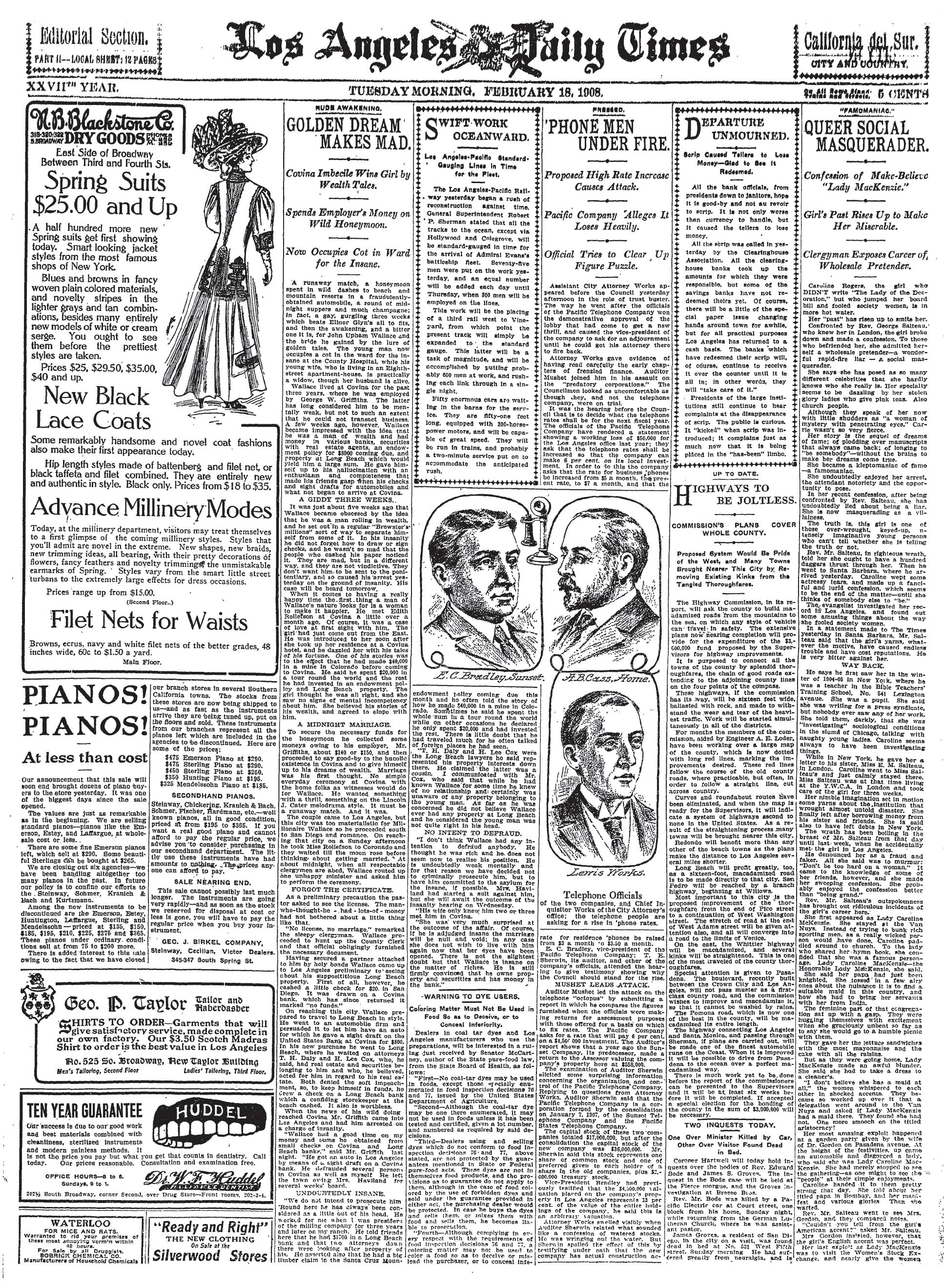 The first is the woman who claimed to be a famous author … the second is a man with delusions of great wealth … Also note that hundreds of men are at work laying streetcar tracks to the ocean so the city can welcome the Great White Fleet …