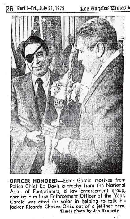 Although his right eye was destroyed, the doctors saved his left eye and after that he wore a eye patch. In November 1959, Garcia was honored with a Purple Heart during a ceremony in the City Council Chambers recognizing officers who had been killed or wounded in the line of duty.